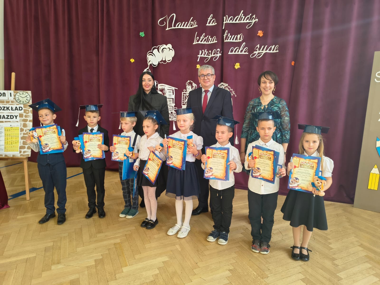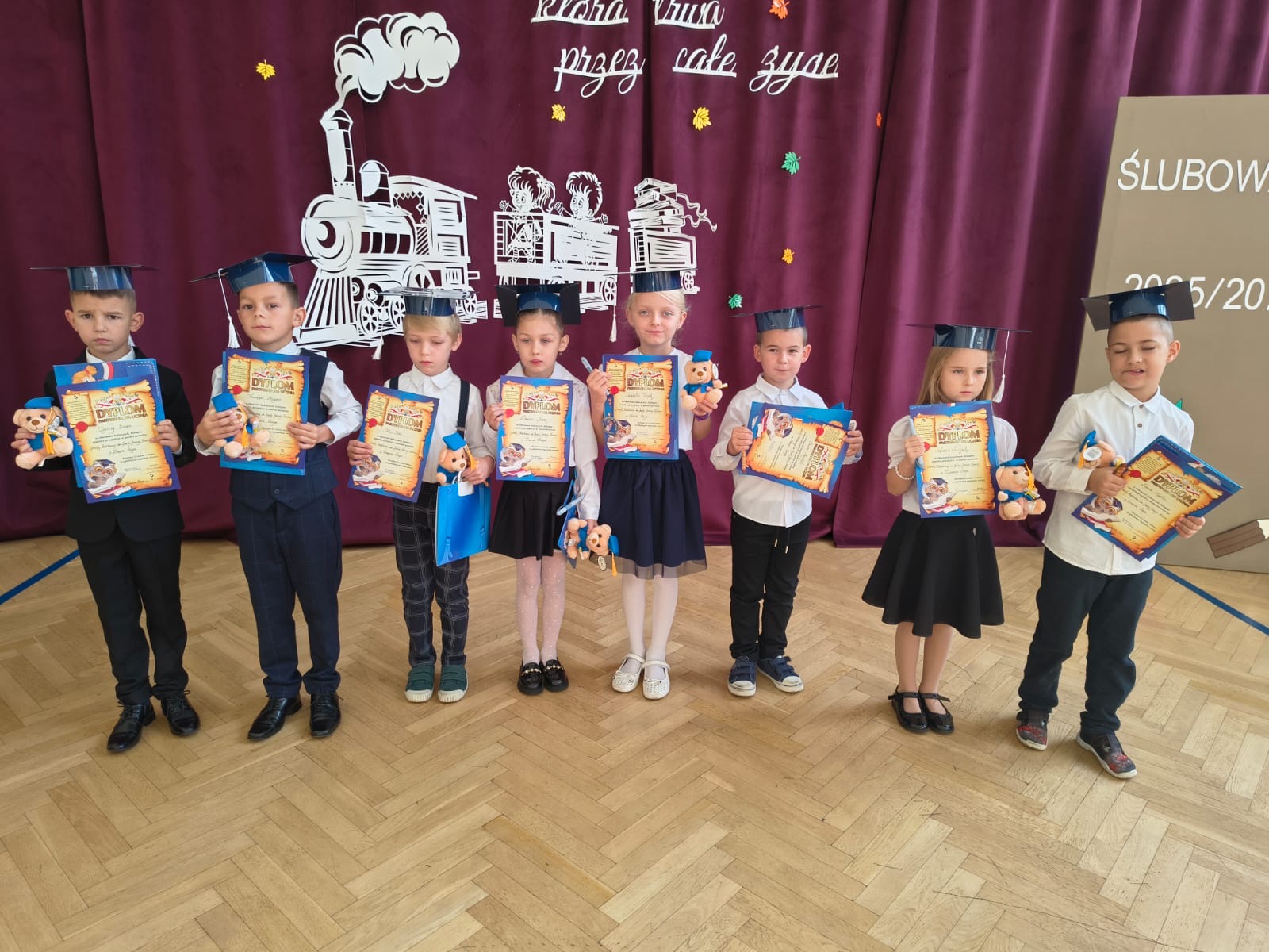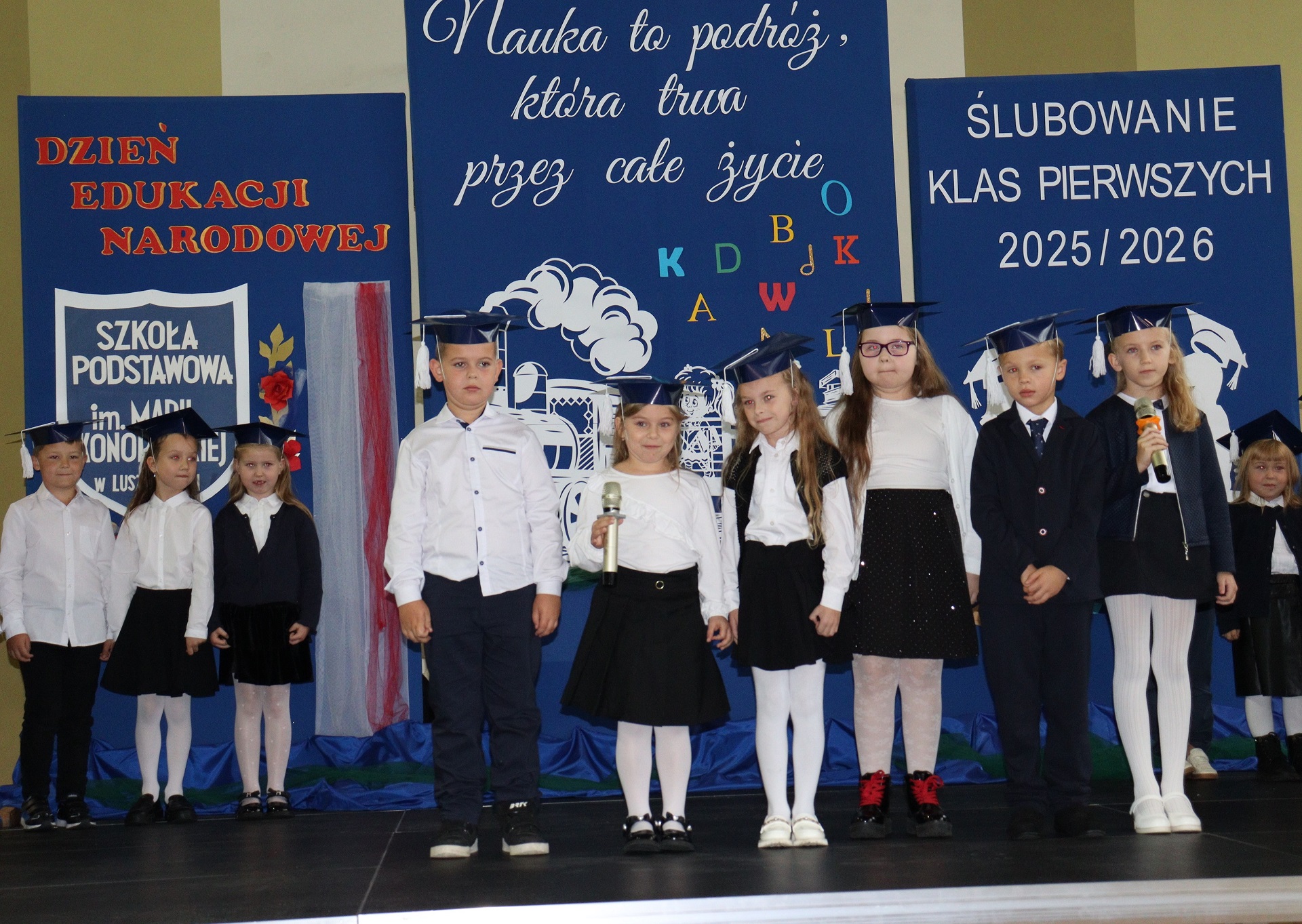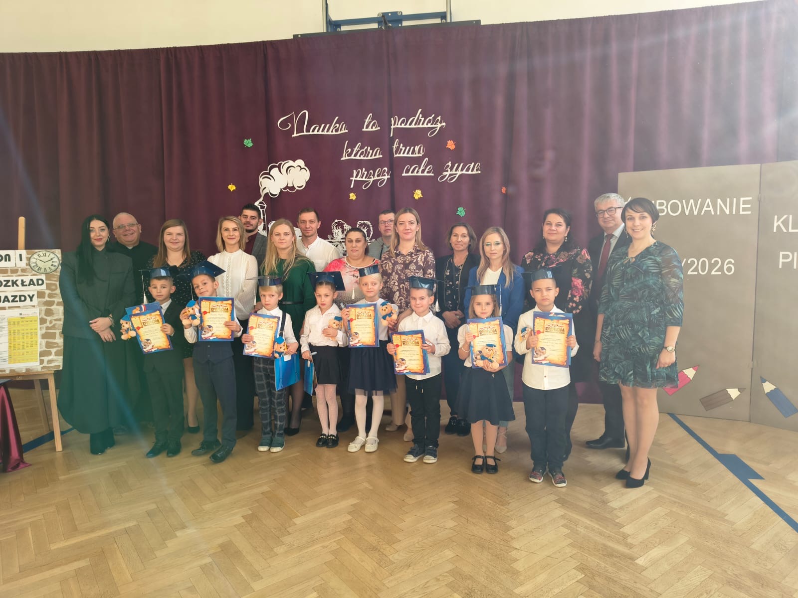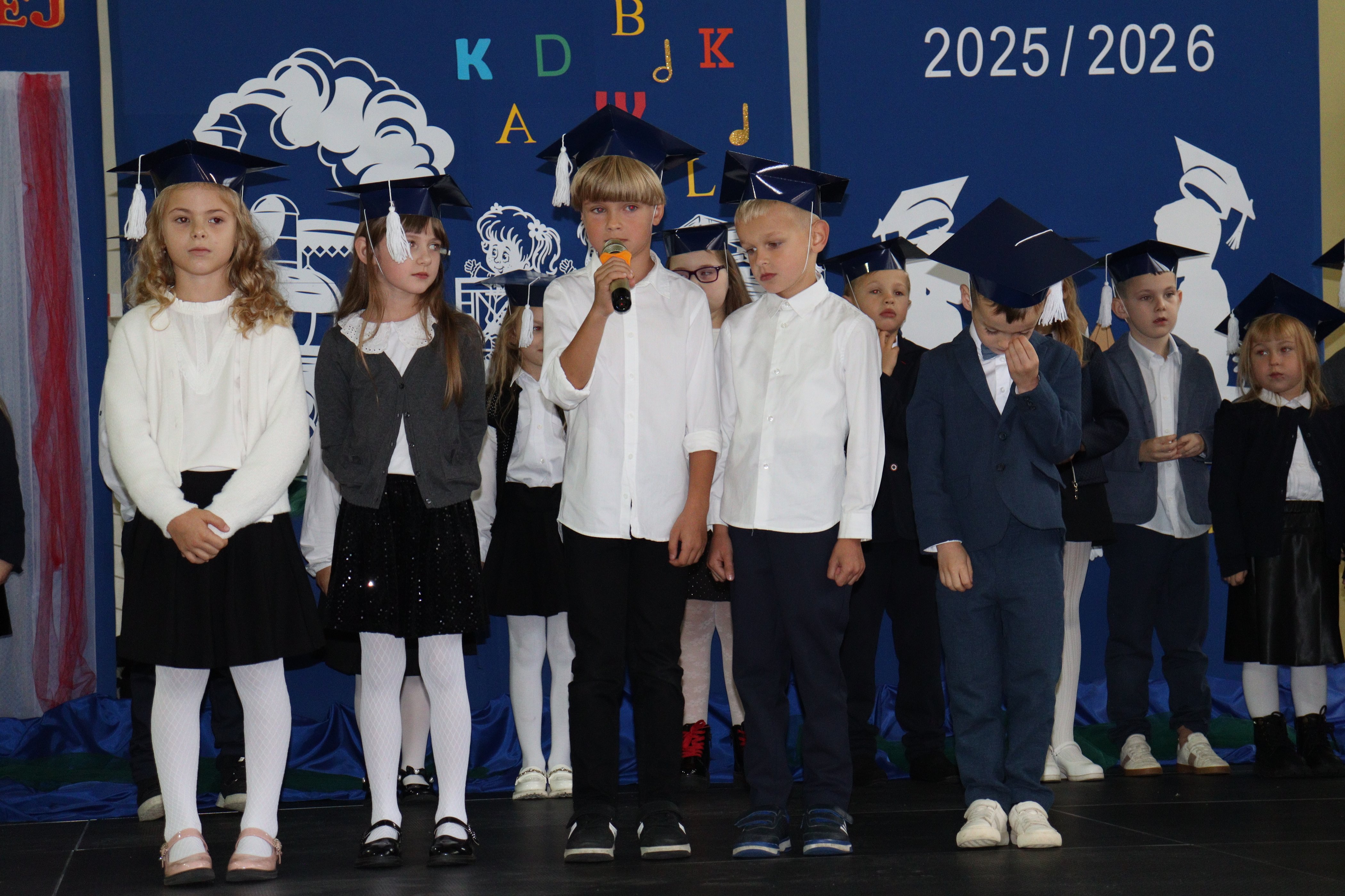 Uroczystość rozpoczęła się od występu artystycznego przygotowanego przez pierwszoklasistów. Dzieci w barwny i radosny sposób opowiedziały o swojej edukacyjnej podróży, pełnej przygód, marzeń i nowych doświadczeń. Nie zabrakło wierszy, piosenek i tańców, które wzbudziły zachwyt wśród licznie zgromadzonych rodziców, nauczycieli i zaproszonych gości.