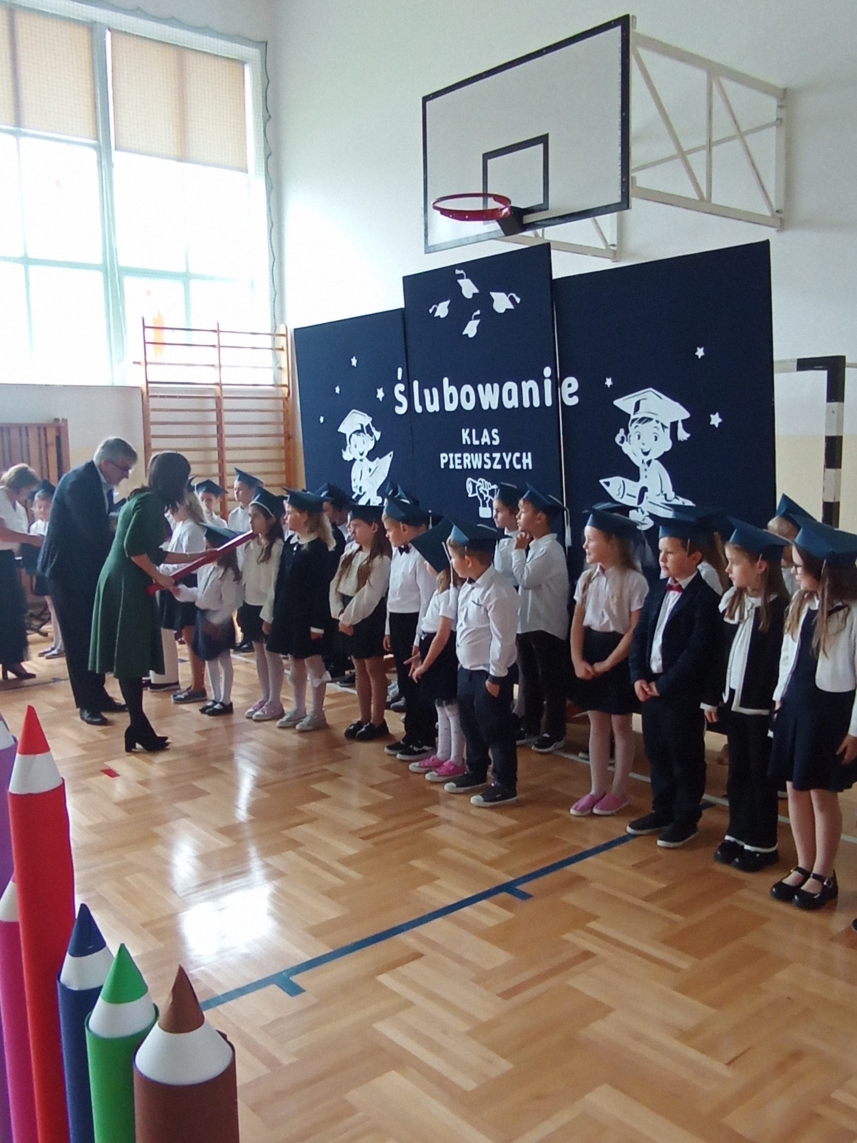 Kulminacyjnym punktem spotkania było uroczyste ślubowanie na sztandar szkoły. Z przejęciem i dumą dzieci przyrzekały, że będą pilnymi uczniami, dobrymi kolegami i będą dbały o dobre imię szkoły. Następnie dyrektor dokonała symbolicznego pasowania na ucznia, dotykając ramienia każdego pierwszoklasisty ogromnym ołówkiem – na znak przyjęcia w poczet społeczności szkolnej. Klasa pierwsza w Szkole Podstawowej im. Świętej Jadwigi Królowej w Zarzeczu Dużym liczy 8 uczniów. Trzy dziewczynki i pięciu chłopców.