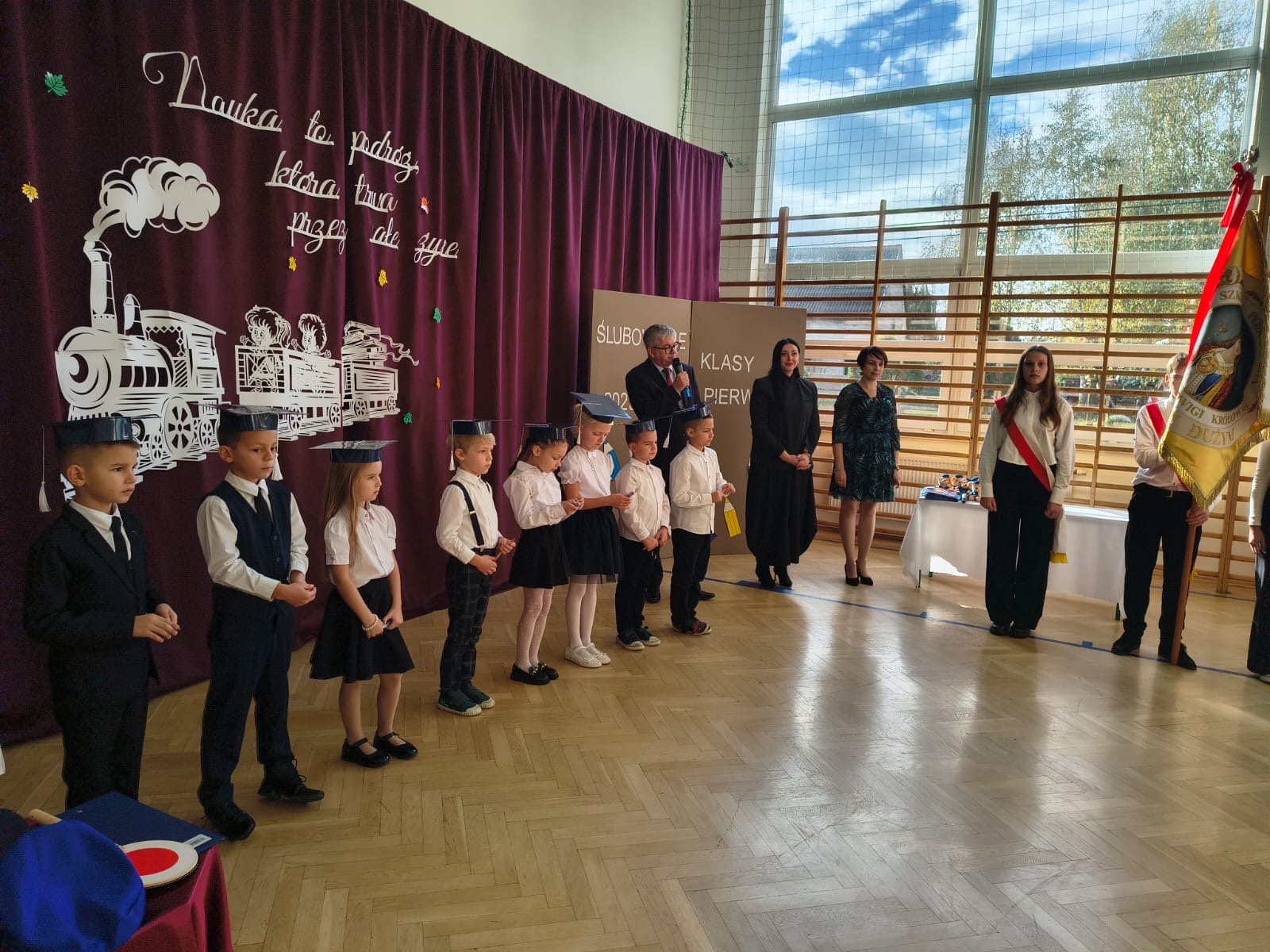 W Szkole Podstawowej im. Świętej Jadwigi Królowej w Zarzeczu Dużym odbyła się wyjątkowa uroczystość – ślubowanie uczniów klas pierwszych pod hasłem „Podróż w pierwszej klasie”. Był to niezwykle ważny i wzruszający moment w życiu najmłodszych uczniów, którzy właśnie rozpoczęli swoją wielką szkolną przygodę.